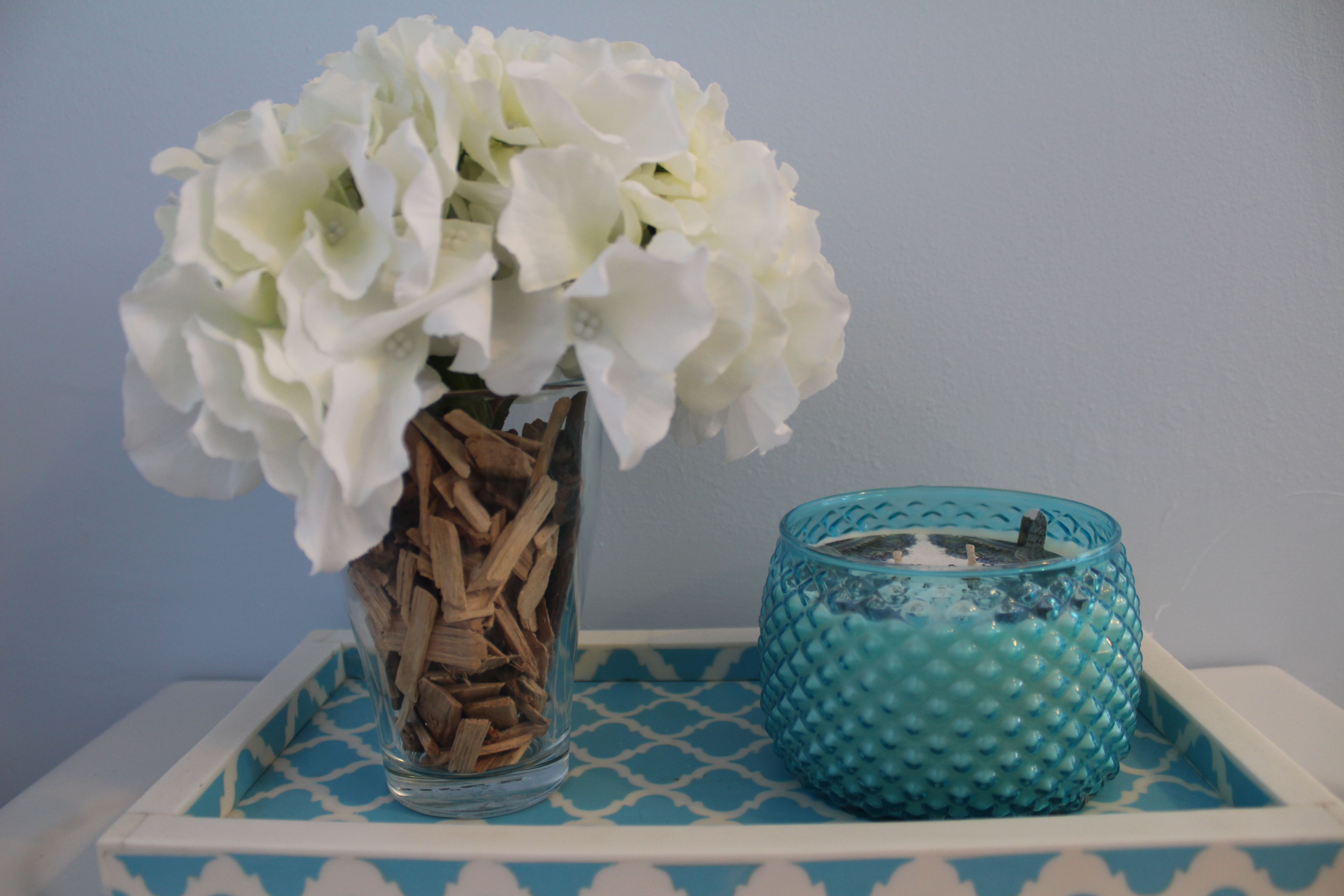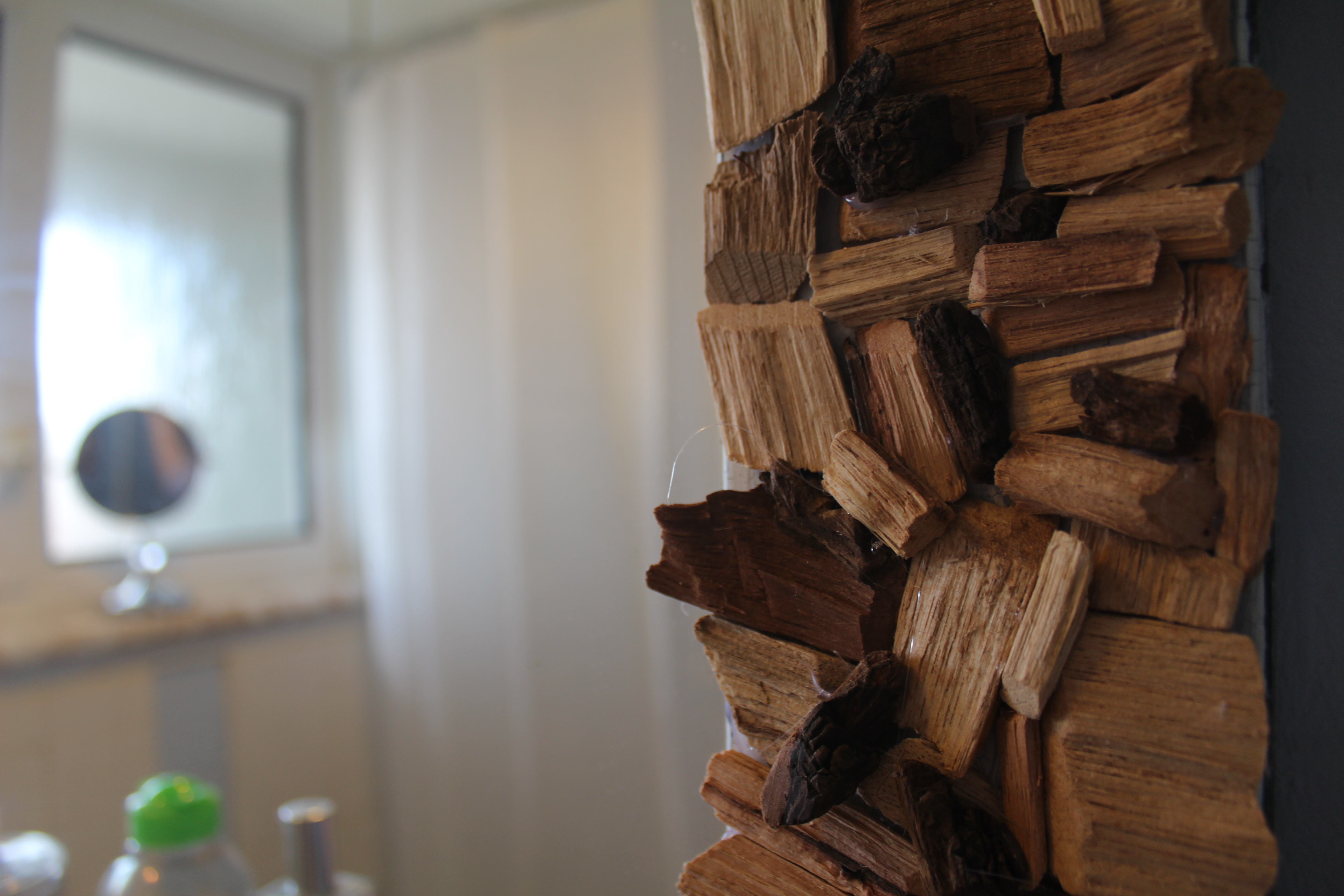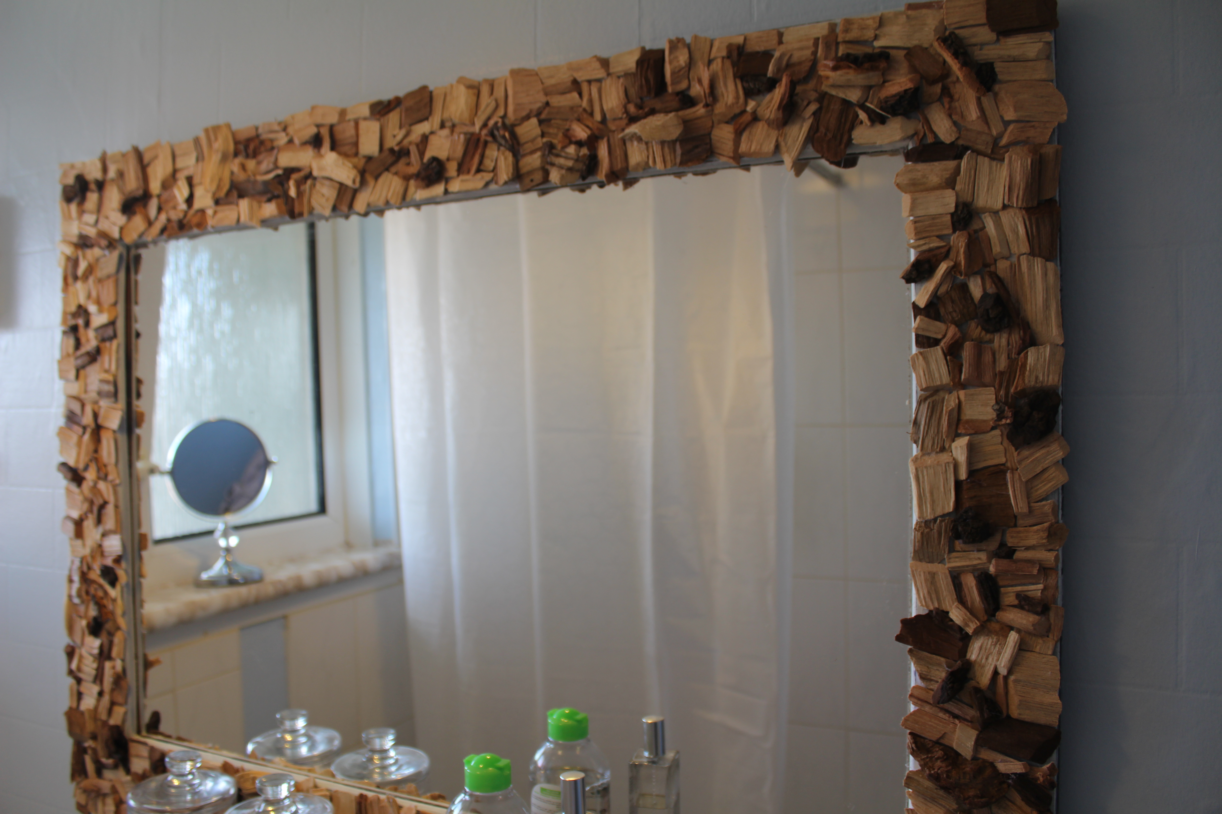 We decided to bring in the element of nature by using flowers and natural wood. We got few bags of natural smoke-wood pieces from e-bay, and used them to top up the glass vases, as well as to stick them around an old mirror frame. To make a mirror we used hot glue gun and a lot of patience. I think the result is worth the time it took! What do you think?