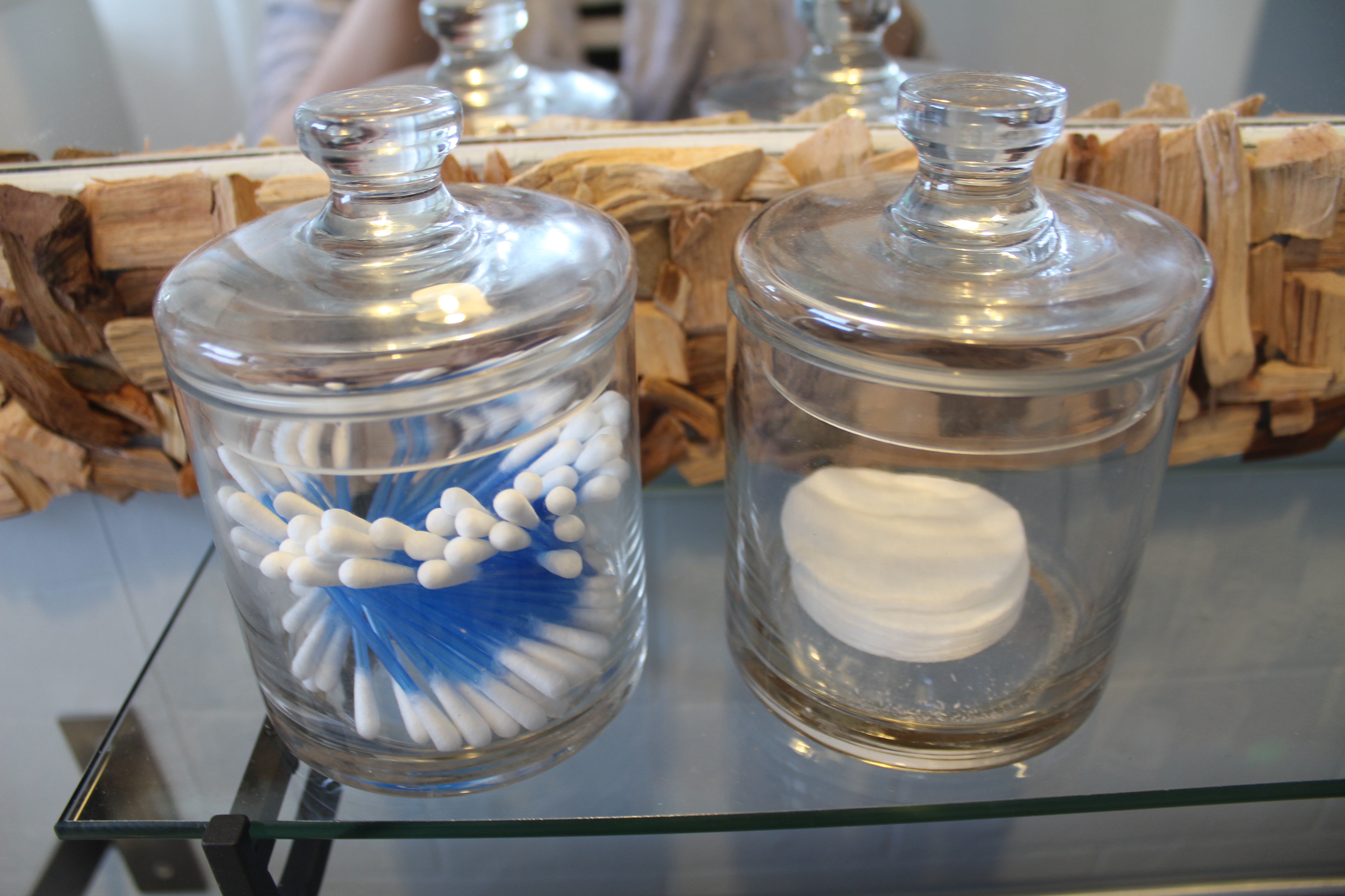 The only few products and containers that we are keeping out are the ones that add to the balance of the decor. Such as are glass containers for cotton balls and ear-picks, as well as just a few transparent bottles of body oils. Talking about transparency, glass shelves are a great way to gain storage without compromising visual space!