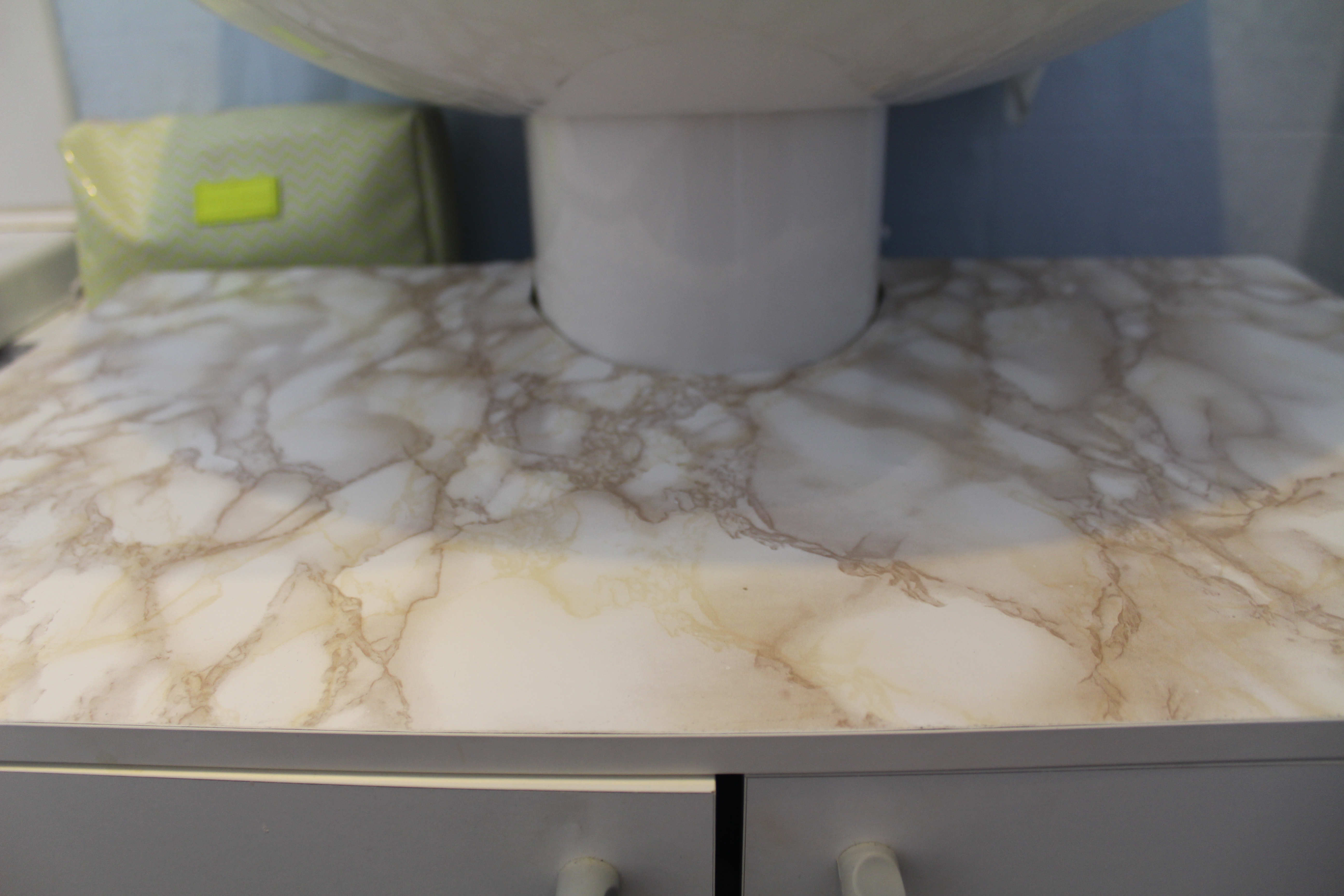 The window shelf of this bathroom has been damaged by the previous owners, therefore we decided to cover it up with the…………sticky waterproof sheet in the pattern of fake stone. We used the same sheets to match up the window shelf with the top of the under-the-sink cabinet. I think it is a great example of how you can take something broken and not only fix it, but also make something even better out of it!